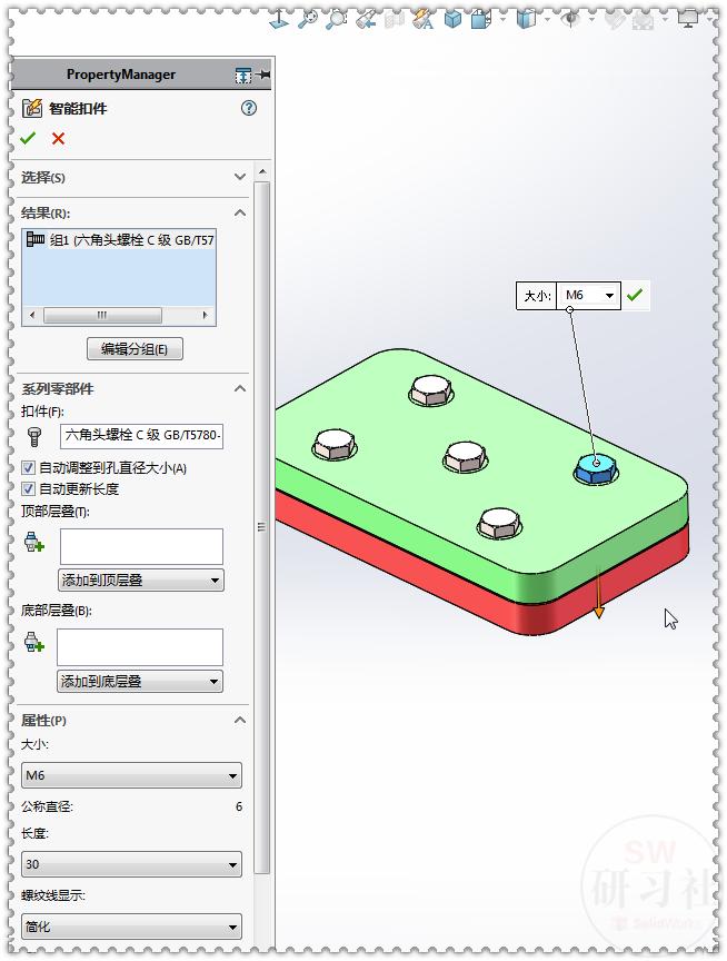 16.【智能扣件】选择立方体顶面:添加 。(螺栓长度:30)