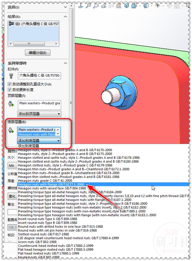 16-2.【添加到底层叠】选择:1. GB/T95-1985的垫片;2. GB/T6177.1-2000的螺母。
