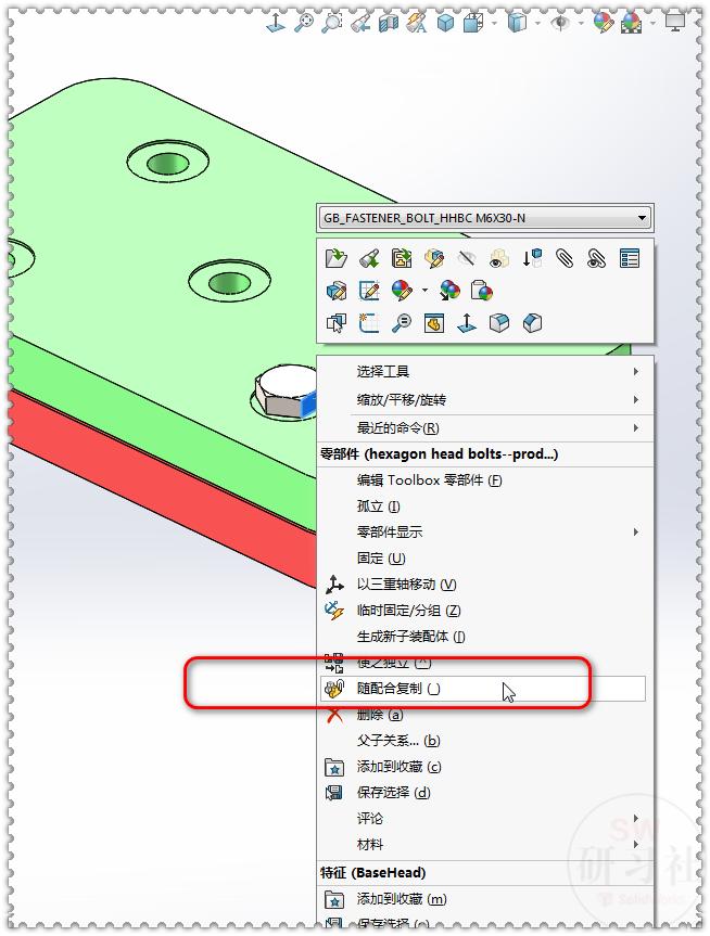 11.在螺栓上【右键】-【随配合复制】,再复制两个螺栓。
