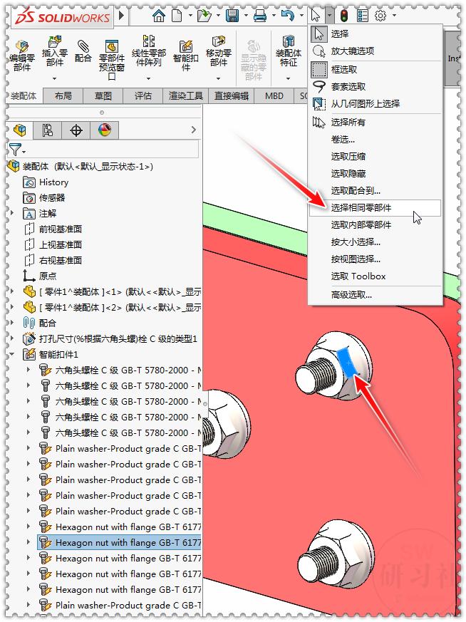 18.选择一个垫片或螺母,【选择】-【选择相同零部件】。