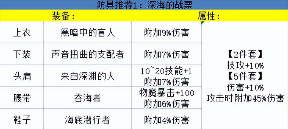 深海套是非常强势的一套,它的核心属性是75%白字,同时还有10%技攻,10%的黄字的加持。虽说这套白字高稀释严重,但是由于加的太多,太过超模,因此它仍是许多本命重甲职业的首选。