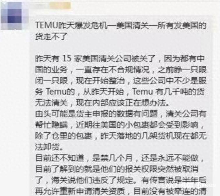 Temu被曝光货物滞留的消息源头,与15家针对美国市场的清关牌照被扣押有关。美国时间5月23日,有消息称15家针对美国市场的清关牌照因为货物申报不合规导致牌照被暂停,而其代理的国内卖家商品也因此无法清关而滞留。自此,流传出跨境圈各大社群的消息里,就有人表示这些受影响的货物主要来自Temu。