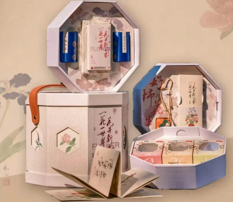 花展伴手礼盒内含上海国际花展七大主题花卉洒金插画折页、插画大师手绘花瓶冰箱贴、沈大成特色糕点、蔡同德堂好柿“花”生香囊以及汪怡记花系列小罐茶等新世界集团老字号品牌的特色产品。