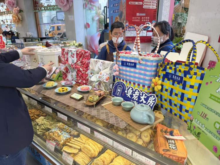 南京路步行街上,沈大成、真老大房的店内,已经摆出了本届花展限定糕点,花朵造型,口感绵密细腻。