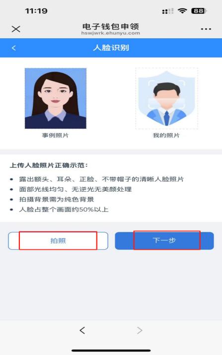 在人脸识别页面点击“拍照”完成人脸识别后点击“下一步”,如下图: