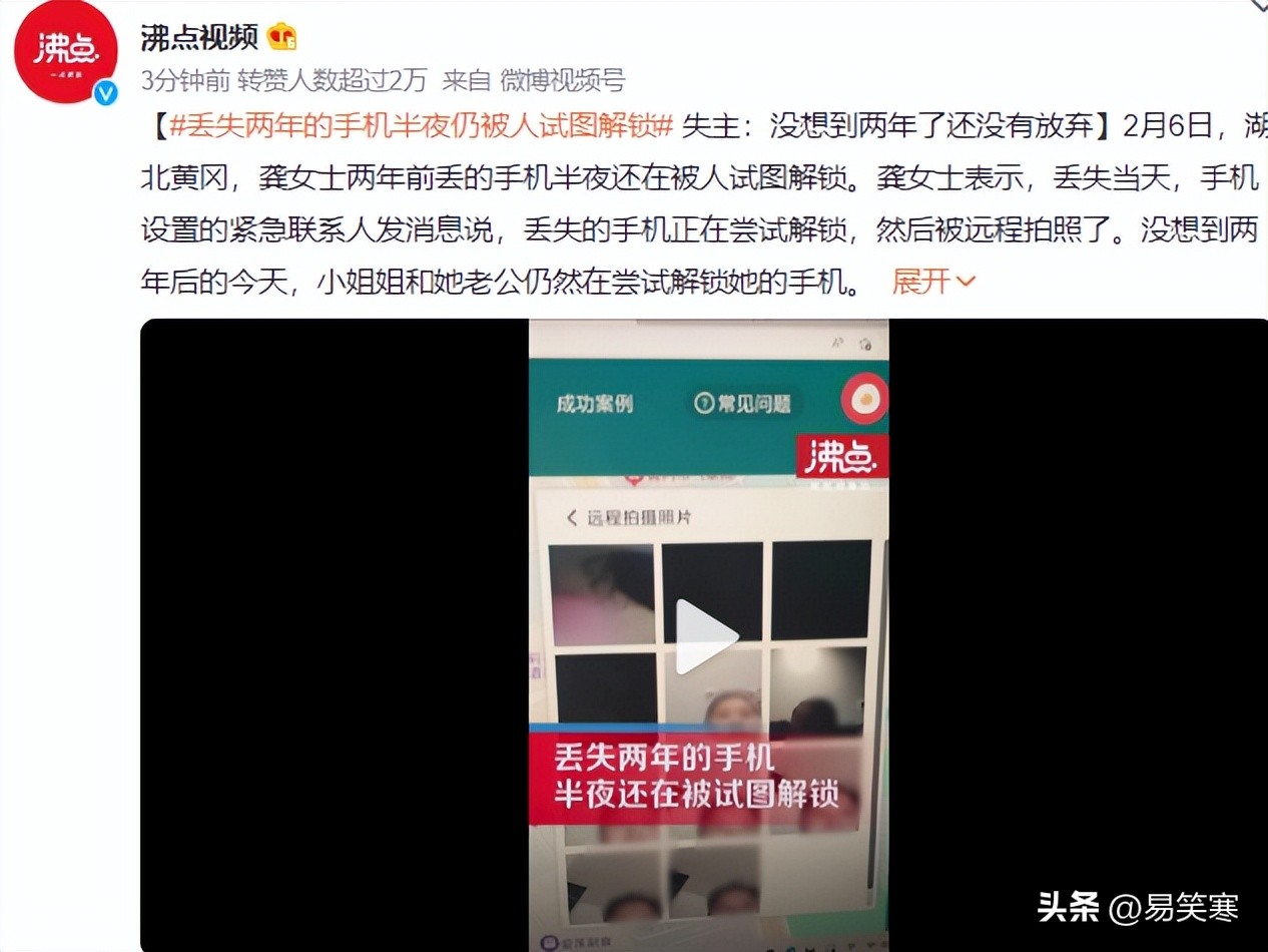 2月6日,湖北黄冈,龚女士两年前丢的手机半夜还在被人试图解锁。龚女士表示,丢失当天,手机设置的紧急联系人发消息说,丢失的手机正在尝试解锁,然后被远程拍照了。没想到两年后的今天,小姐姐和她老公仍然在尝试解锁她的手机。