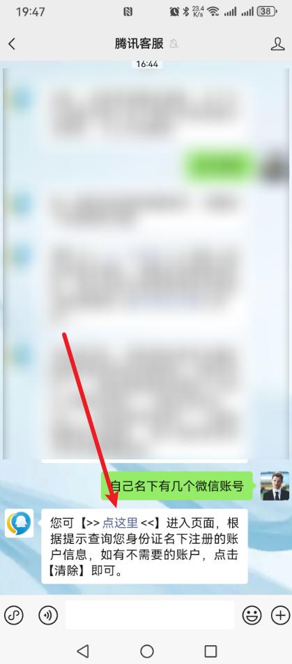 第四步:然后在输入框写入“自己注册了多少微信号怎么查?”,接着客服会回复一段文字,我们根据提示点击【点这里】进行查询,如下图所示: