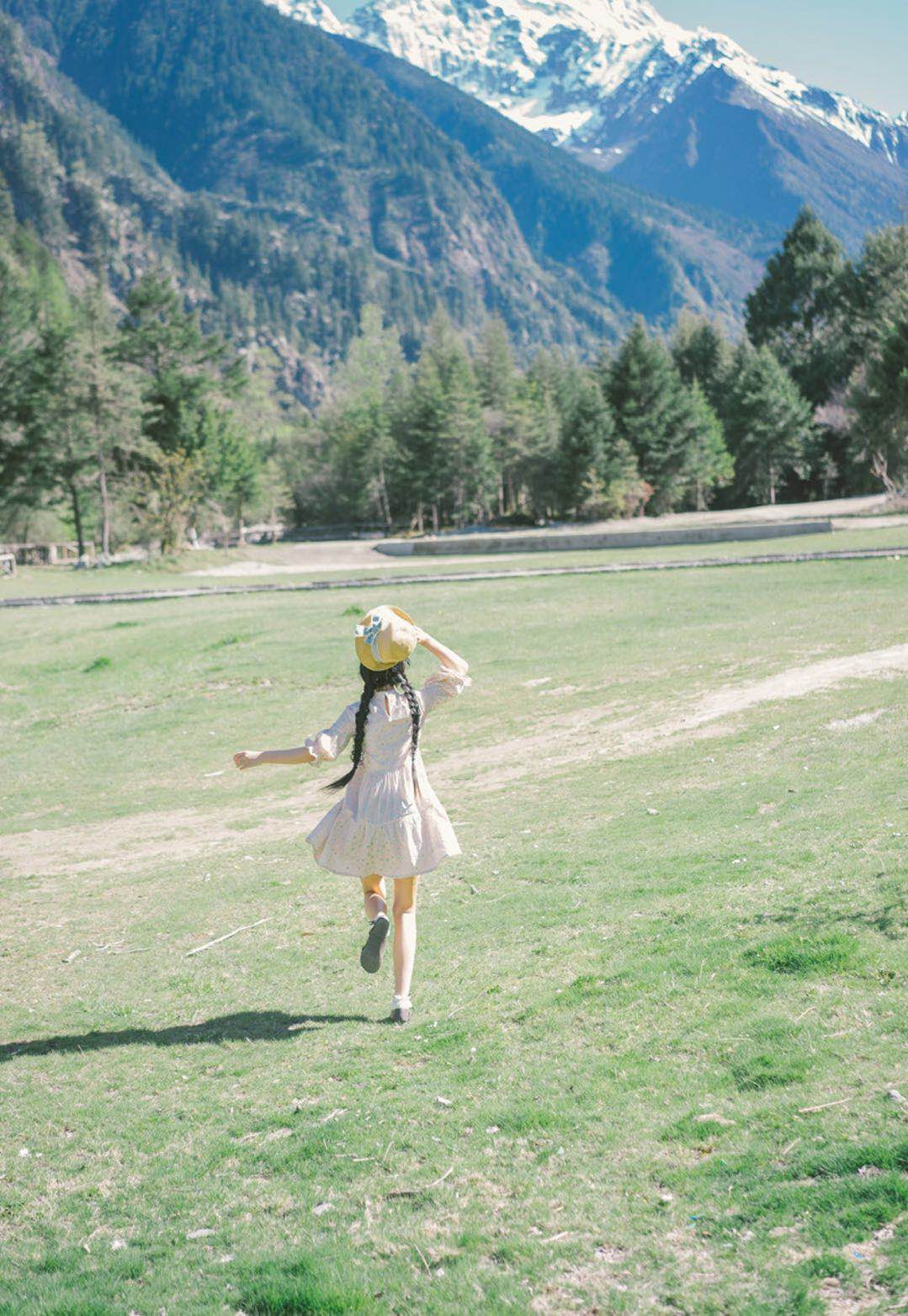 如果是以草地为拍照大背景,奔跑的姿势一定要尝试一下,不仅可以让画面更显丰富和活力,还能避免刻意摆拍的尴尬,但拍摄奔跑人像记得要多抓拍并且尽可能拍摄背面照,以此提高成片率。