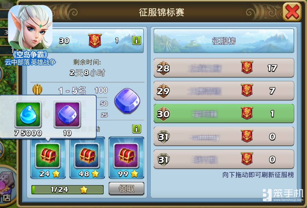 人物等级达到10级后,搜索对手进入PVP战斗即自动参与征服锦标赛,除了排名靠前的玩家可以获得玛瑙资源奖励外,胜利的星数达到一定数量后也能开启宝箱获得资源奖励。