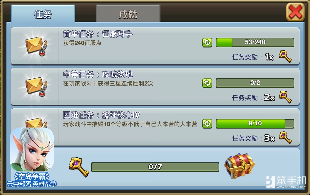 点击主界面左上角的【任务】进入成就界面,完成里面的成就可以领取不同数量的宝石奖励。