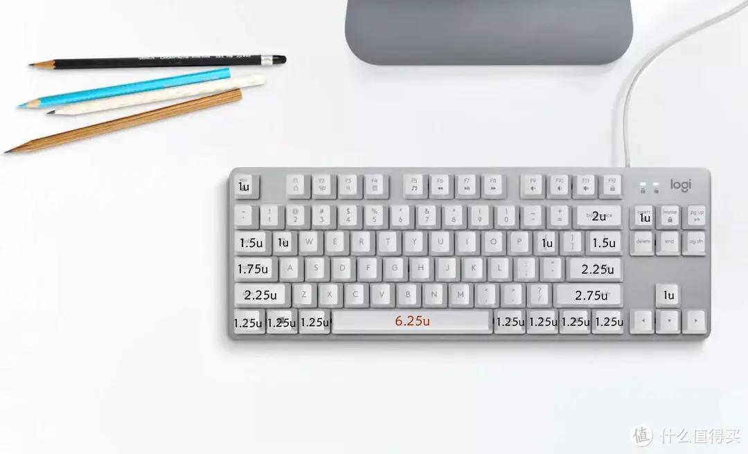 基于一把标准的美式键盘配列,我们将字母区的任意一颗键帽视为标准的1u长度,其余键帽按照1u长度的倍数来标记,比如常规的空格长度是6.25u、Ctrl键长度为1.25u、退格键长度就是2u。80%(87键)、60%(61键)这两个配列是基于全尺寸标准美式键盘直接舍去某一键区得到的产物,所以是可以和104键/108键这种全尺寸键盘通用键帽的。