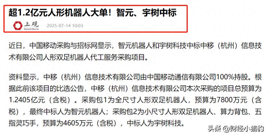 - 中国移动1.24亿元代采大单揭晓:智元拿下 7800 万元全尺寸人形机器人包件,宇树中标 4605 万元小尺寸整机及关键部件。