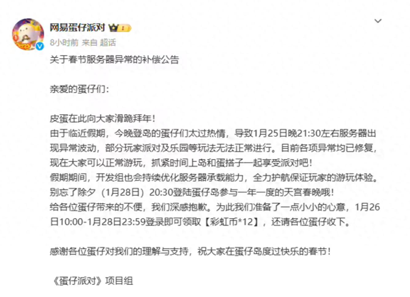 项目组在公告中表示,由于临近假期,登岛游玩的玩家热情高涨,导致1月25日晚21:30左右服务器出现异常波动。目前,各项异常均已得到修复,玩家们可以正常进入游戏,享受派对的乐趣。