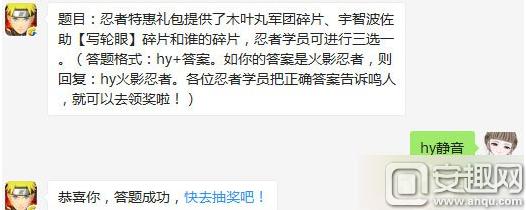 题目:忍者特惠礼包提供了木叶丸军团碎片、宇智波佐助【写轮眼】碎片和谁的碎片,忍者学员可进行三选一。(答题格式:hy+答案。如你的答案是火影忍者,则回复:hy火影忍者。各位忍者学员把正确答案告诉鸣人,就可以去领奖啦!)