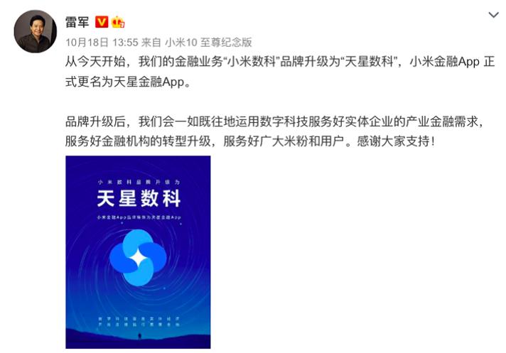 2020年10月18日,“小米数科”将品牌升级为“天星数科”,天星数科旗下面向个人用户的金融服务产品——小米金融App也更名为天星金融App。当时,小米CEO雷军还为其在微博宣传。