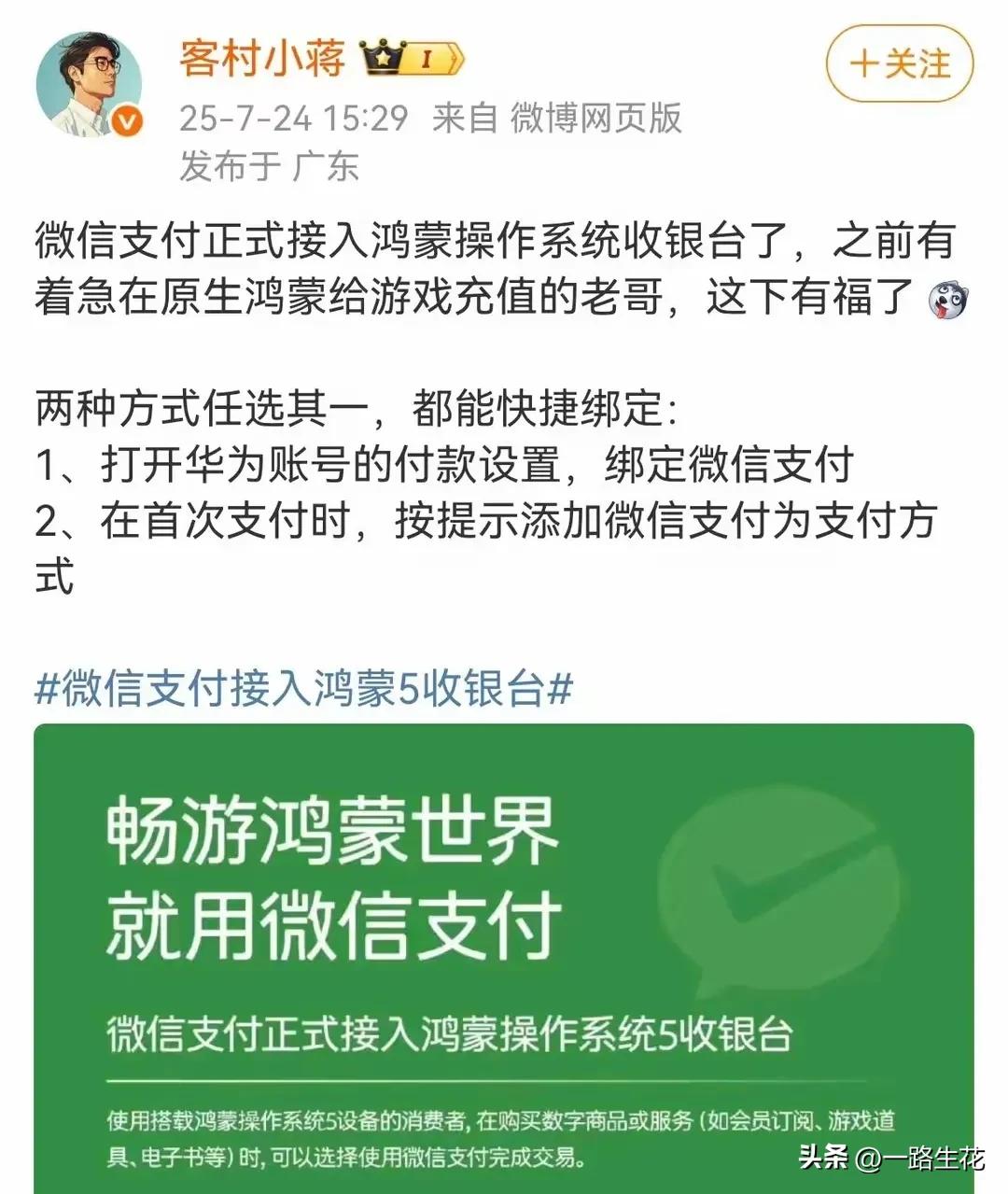2025年7月24日,华为突然宣布微信支付正式接入鸿蒙5收银台。这个消息在科技圈炸开了锅,毕竟鸿蒙和微信这对“欢喜冤家”的合作一直备受关注。这次微信支付的加入,到底能给我们的生活带来哪些变化?鸿蒙生态又会因此产生什么化学反应?今天咱们就来好好唠唠。
