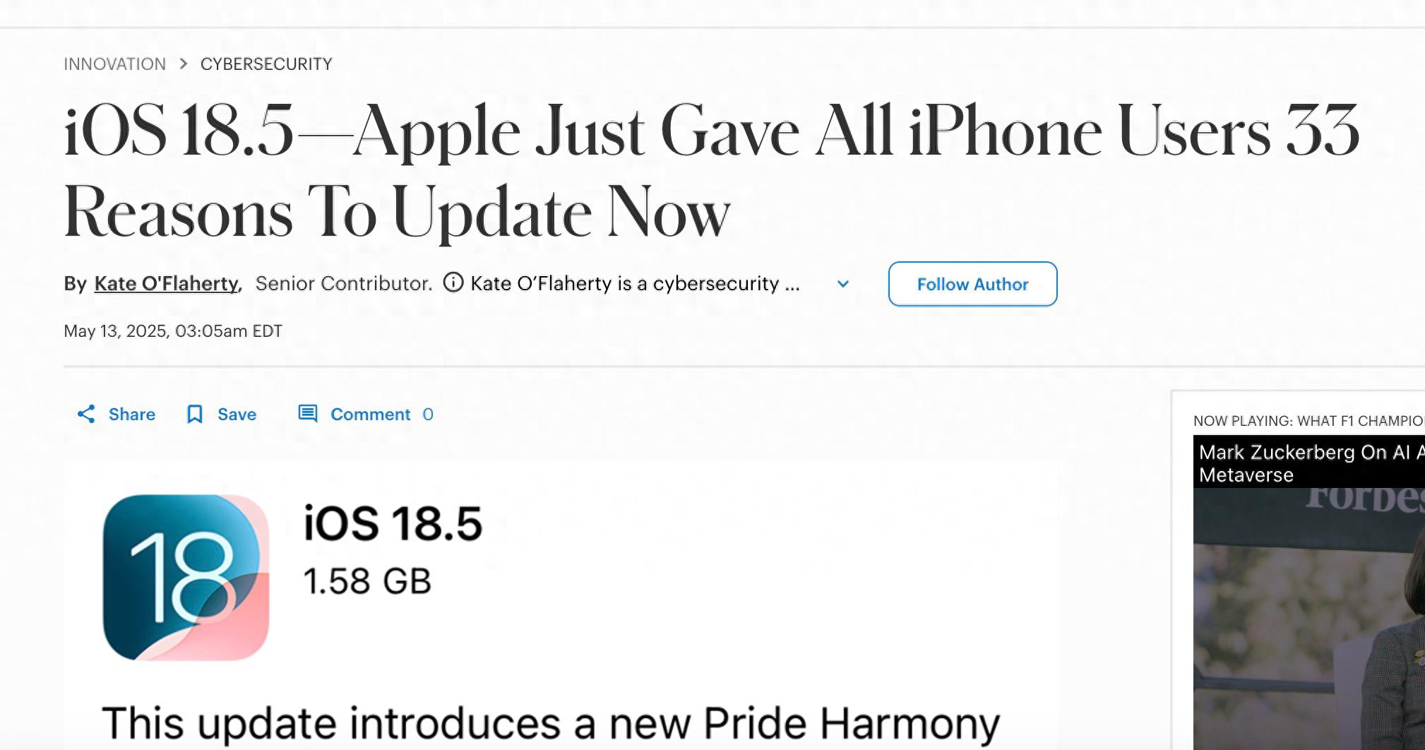 福布斯认为,苹果的 iOS 18.5 是一项重大升级,包含 30 多项重要安全修复、增强了 AI 隐私、邮件应用更新以及全新的 Pride Harmony 壁纸。它还修复了 iPhone 最新更新iOS 18.4.1中可能存在的漏洞问题。所有这些都使得 iOS 18.5 更新值得尽快应用。