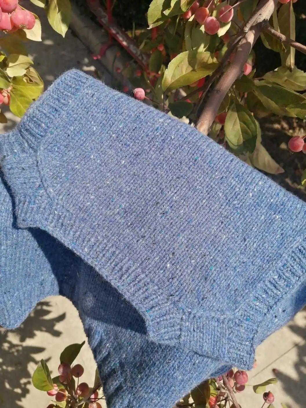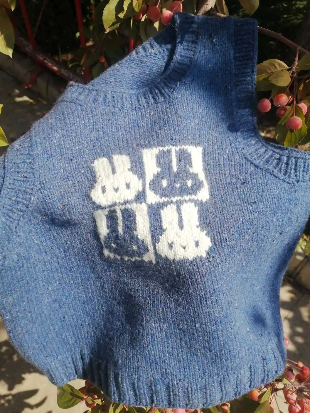 3.正面缝合前后片,3.25针挑织领子,前后领收针地方一针挑一针,其他部分四挑三,挑96针织单螺纹8行套收。