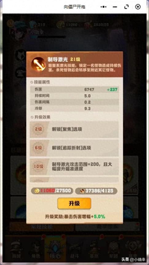 核心技能介绍,制导激光是能量系列的激光技能,锁定一个怪物以后,会持续的对敌人造成伤害,消灭怪物以后,会转移到附近的其他怪物身上,直至持续时间结束。