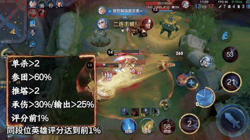 需要我们线上单杀次数超过两次,参团率大于60%,推塔数量大于两座,坦边英雄承伤需要大于30%,战边输出需要大于25%,同段位同英雄评分达到前1%。