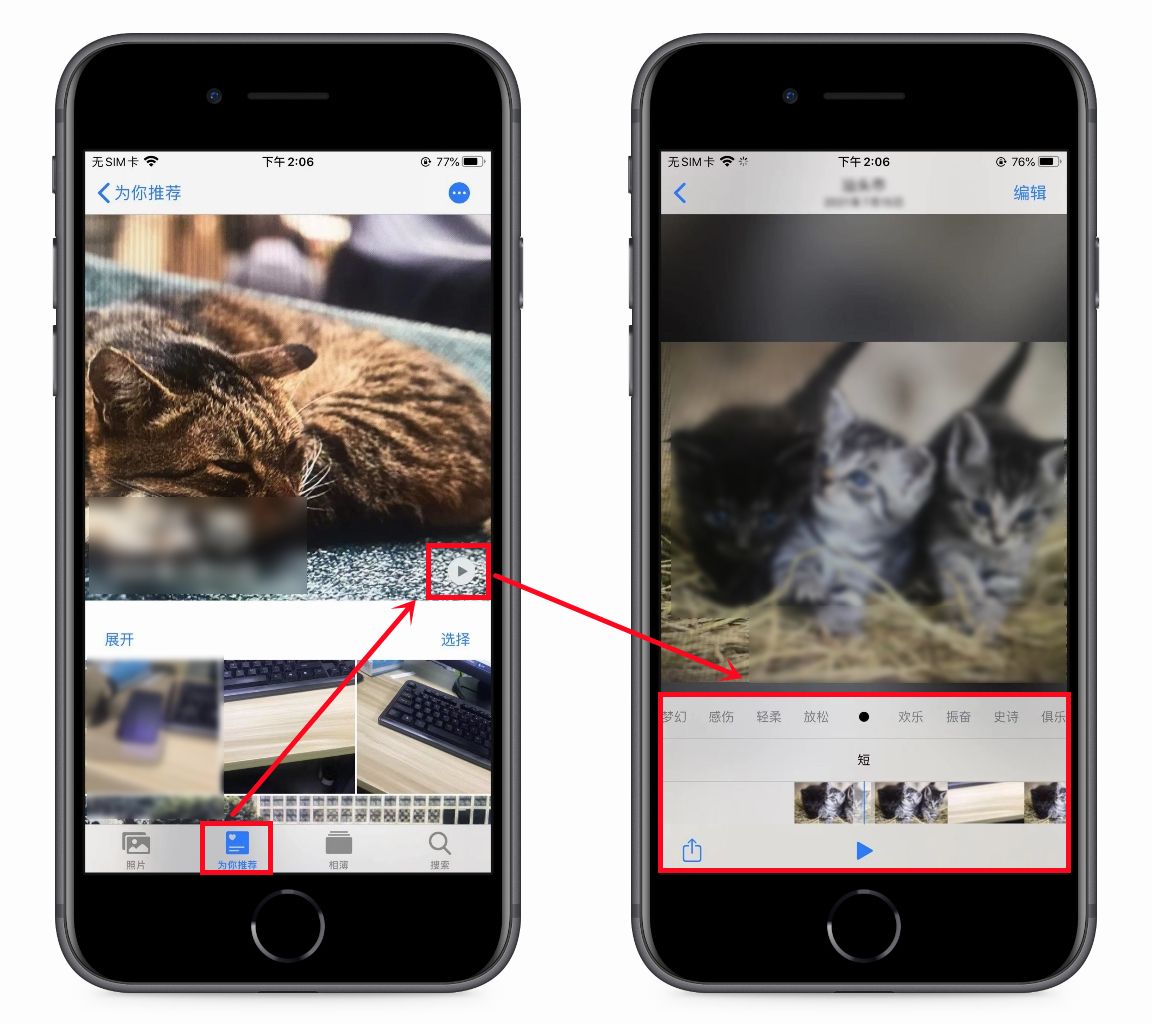 「操作方法」:打开相册→进入【为你推荐】→系统自动将照片归类并转换为视频→我们可以根据需要可以自由编辑视频长短、BGM等。