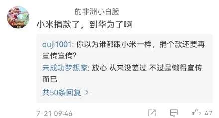 郑州暴雨发生之后,小米反应迅速,率先表示捐款5000万元。之后OPPO、vivo也纷纷捐款5000万元,华为自然也被网友们盯上了。