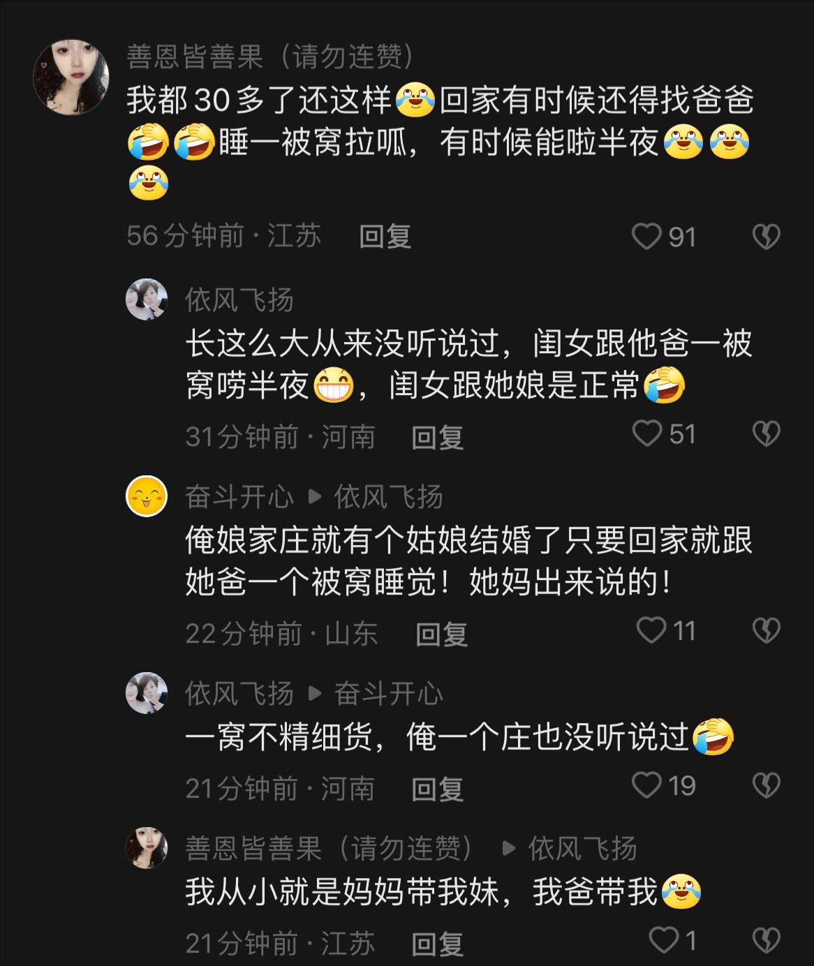 北方很多农村地区都有睡炕的习惯,一户人家往往会有很多孩子,一家人为了取暖会挤在一张炕上面,可是从来没有听说过儿女跟父母一个被窝的说法。这位网友的例子较为罕见,但绝不是个例,因为在大部分人表示不理解的时候,总有那么零星几个人站出来力挺她。