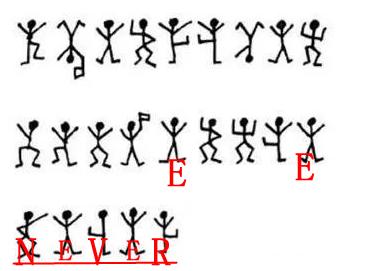 福尔摩斯指出,在英文书写中,出现频率最高的字母是E,而第一组信息15个“跳舞小人”中,有4个完全一样,于是先假设这4个一样的“跳舞小人”代表E。