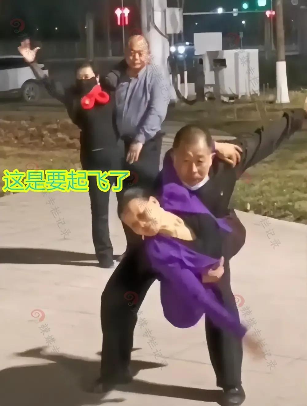 大婶在翩翩起舞,大爷在围着大婶转,左转转,右转转,像个护花使者……