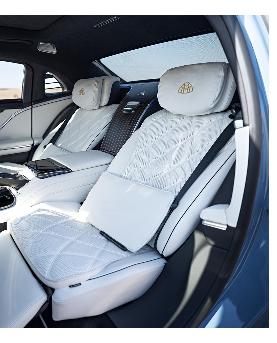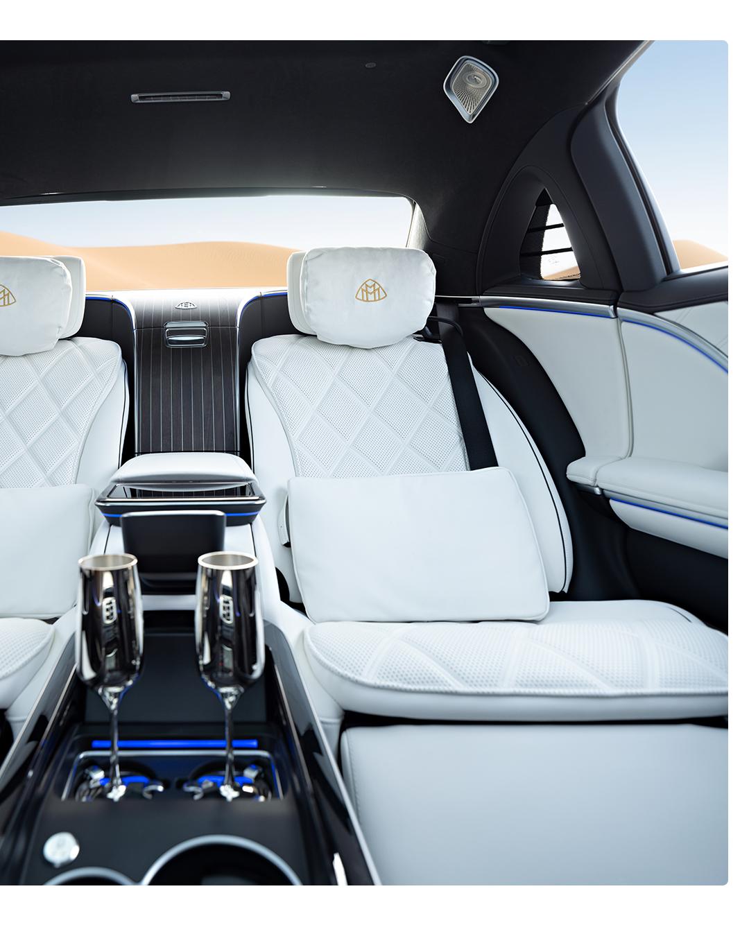 后排采用的是两个独立座椅,车载冰箱、舒适头枕等都没有缺席,而且还加入了专属刺绣,座椅支持电动调节、按摩、加热和通风等功能。