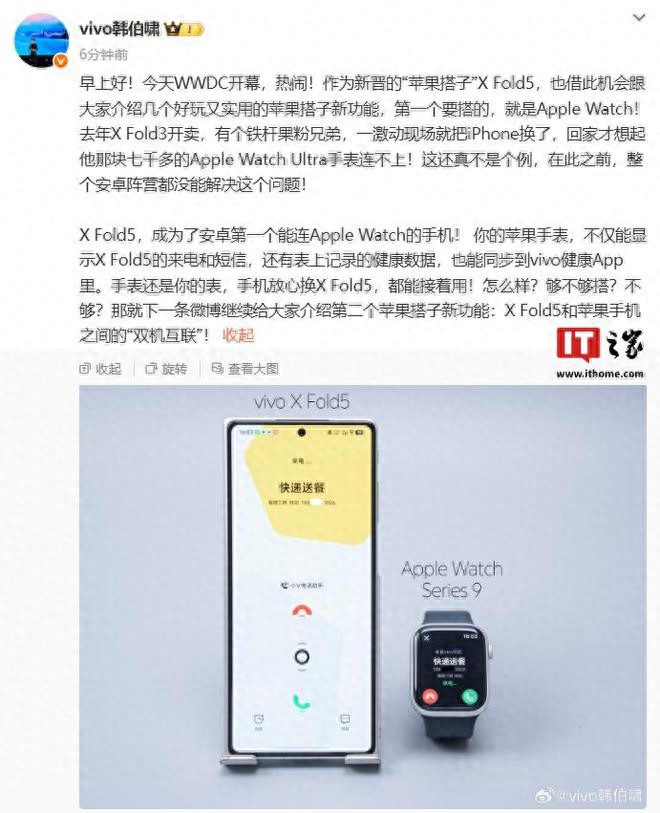 6 月 10 日消息,vivo 通信科技有限公司产品经理韩伯啸今日发文宣布,vivo X Fold5 折叠屏新机将成为安卓第一个能连 Apple Watch 的手机。