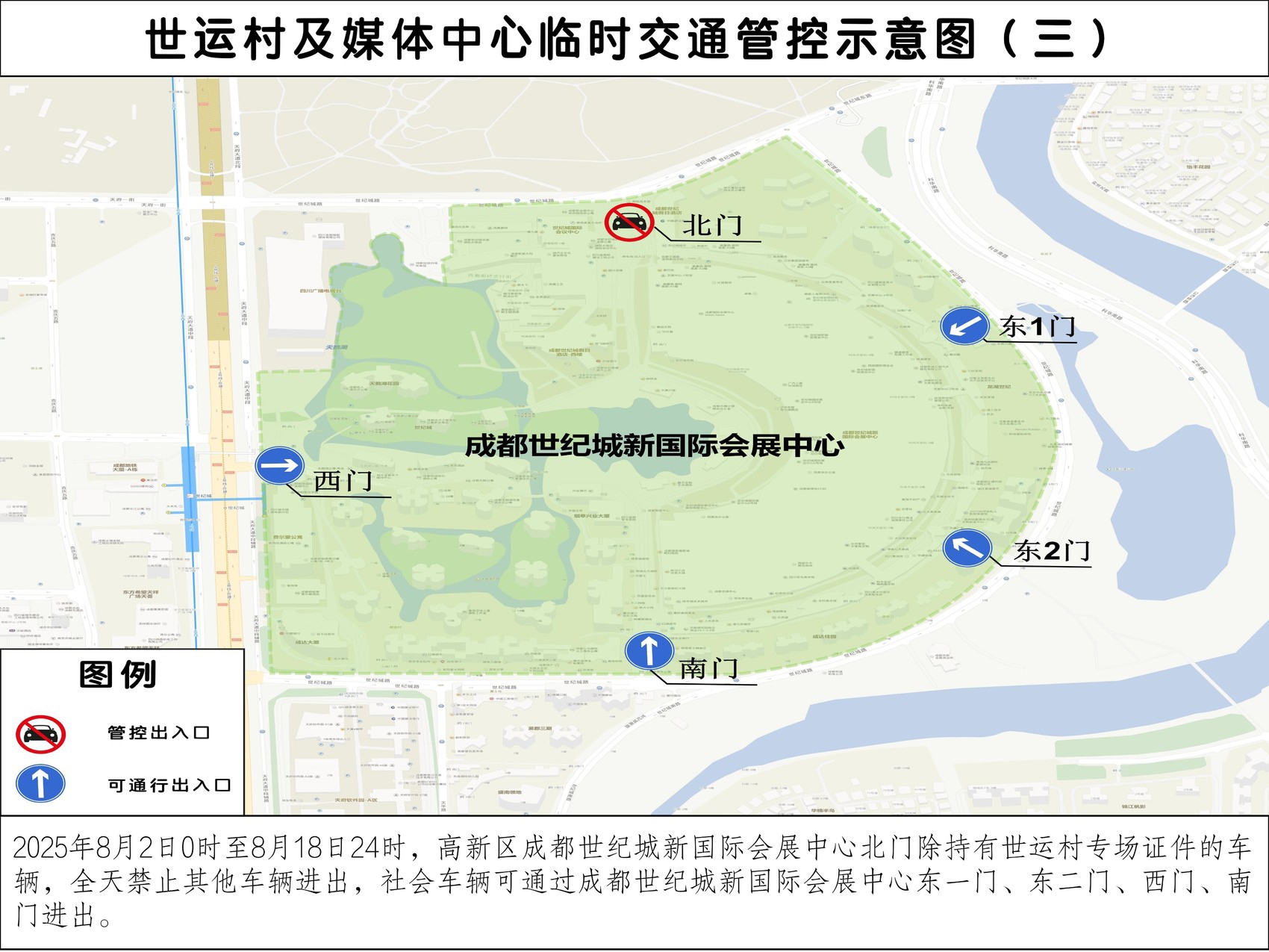 8月2日0时至8月18日24时,高新区成都世纪城新国际会展中心北门除持有世运村专场证件的车辆,全天禁止其他车辆进出,社会车辆可通过成都世纪城新国际会展中心东一门、东二门、西门、南门进出。