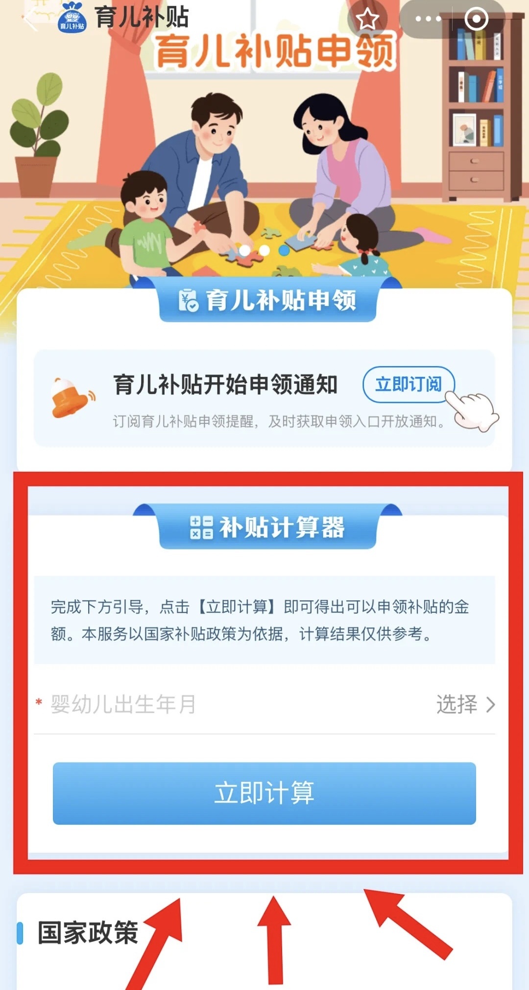 五、点击“育儿补贴计算器”,输入孩子出生年份可计算领取具体金额
