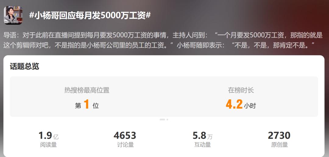 对于此前在直播间提到每月要发5000万元工资的事情,主持人问道:“一个月要发5000万元工资,那指的就是这个剪辑师对吧,不是指的是小杨哥公司里员工的工资?”小杨哥随即表示:“不是,不是,那肯定不是。”