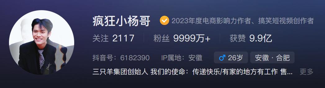 平台账号显示,“疯狂小杨哥”是抖音首个粉丝过亿的达人主播。此前,抖音并无粉丝破亿的个人账号。