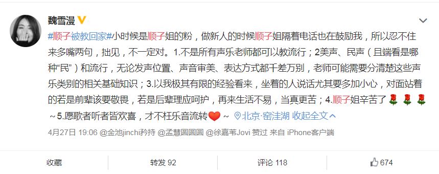 选秀出身的歌手魏雪漫也站出来为顺子“发声”。她同样也强调了流行与民族美声唱法间存在差异,认为声乐老师并未分清之间的区别。