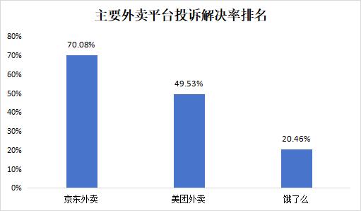 在解决率方面,京东外卖的解决率最高,为 70.08%;美团外卖次之,解决率为 49.53%;饿了么的解决率仅为 20.46%。