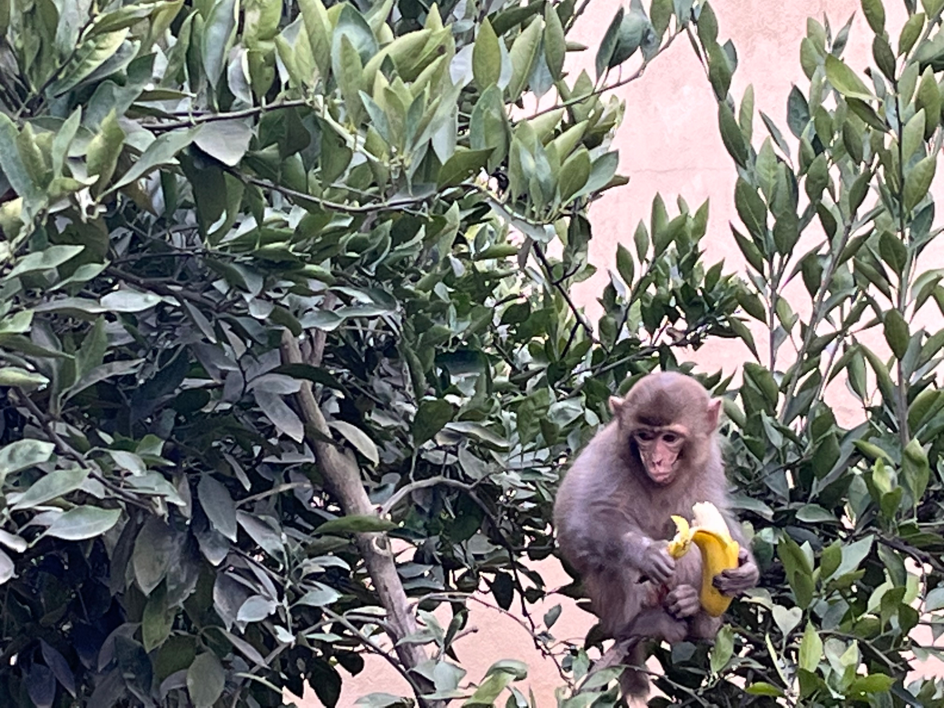 妙趣横生!野生猕猴蹲在树枝上吃香蕉