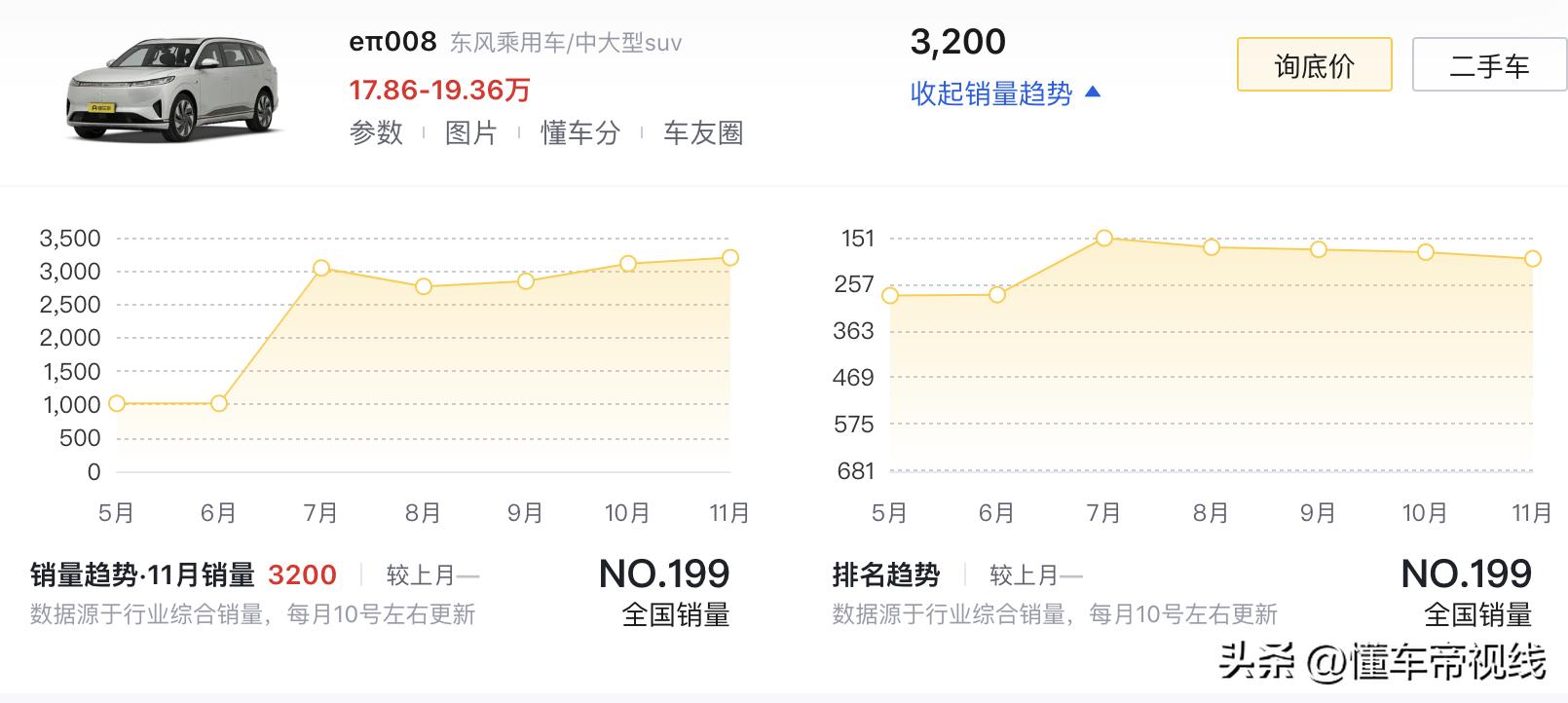 从车型定位来看,东风奕派eπ008定位于中大型SUV,主要竞争对手指向理想L6(指导价24.98万-27.98万元)、问界M7(指导价24.98万-32.98万元)等车型。11月销量显示,eπ008当月销量为3200辆,保持了相对稳定的销量趋势。有关东风奕派的更多消息,我们将保持关注。