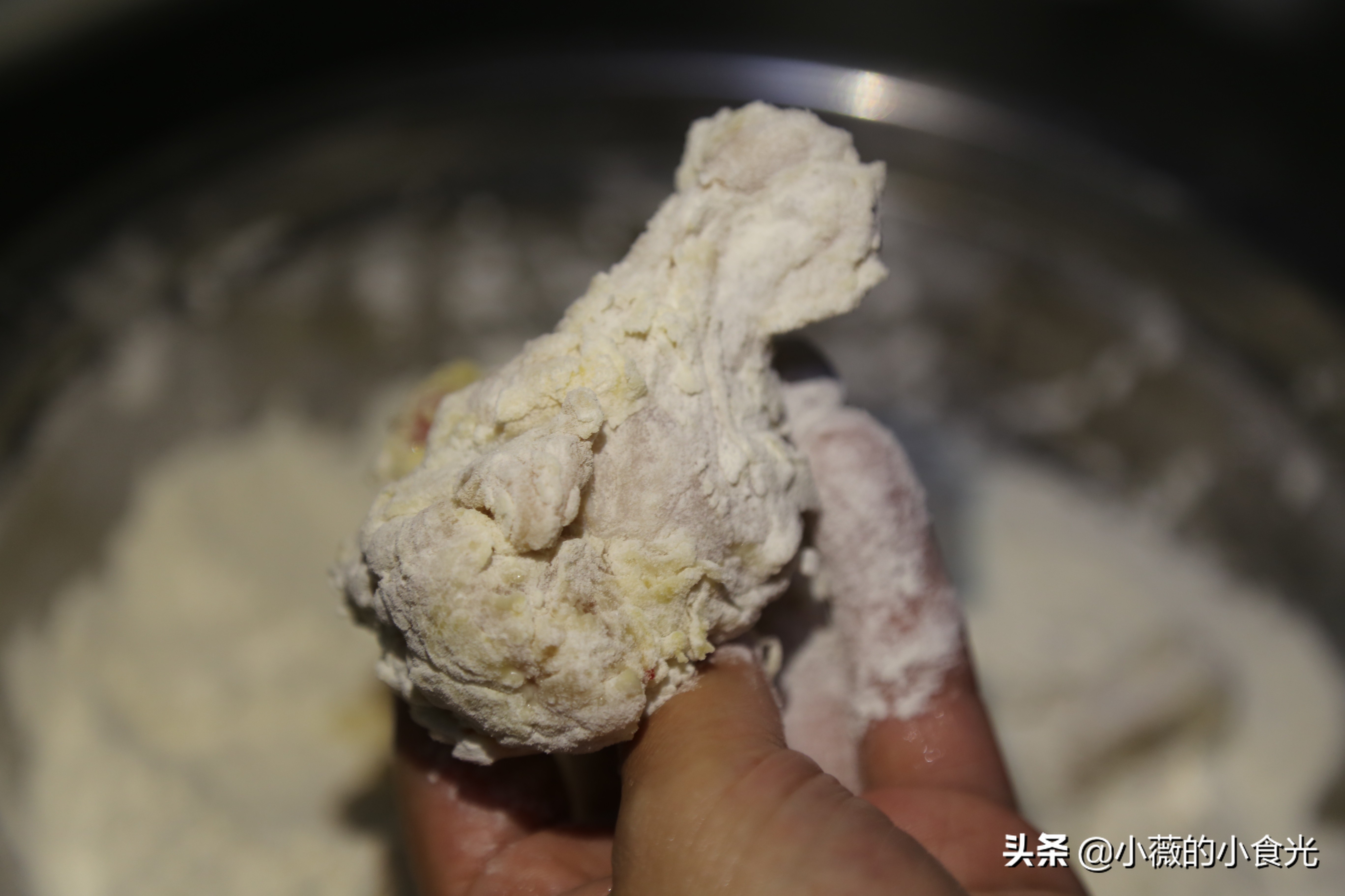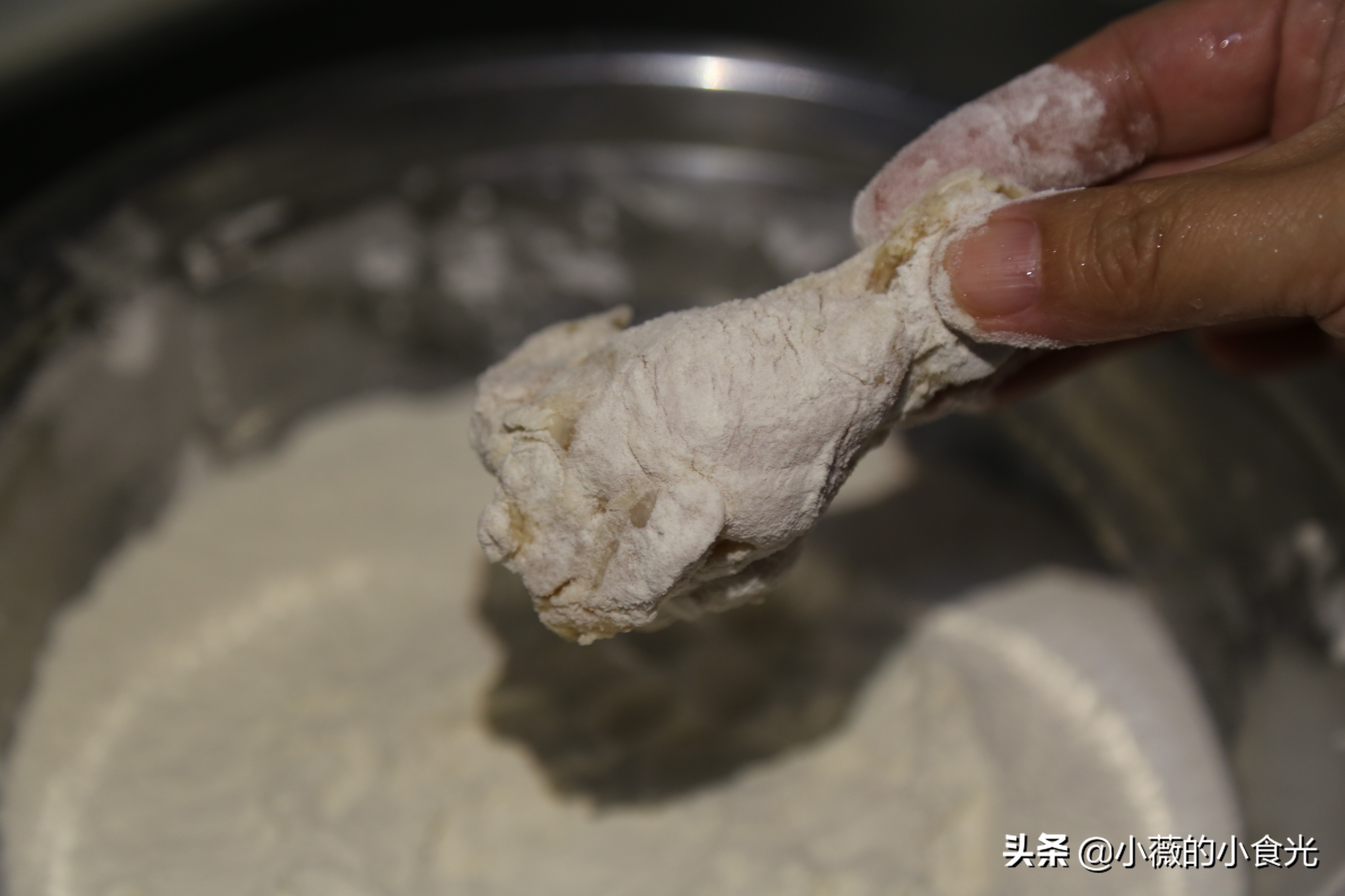 6、 再次放入粉料中蘸上面粉,双手配合边蘸粉料边按压揉搓,因为之前蘸有蛋液鸡翅表面很湿润,可以很方便的裹上面粉。双手揉搓就能很好的形成鳞片状,搓过后如果表面的粉料不多,就再蘸上一些,蘸好后再次揉搓,直到达到自己满意的鳞片状即可,记得把多余的面粉抖掉。