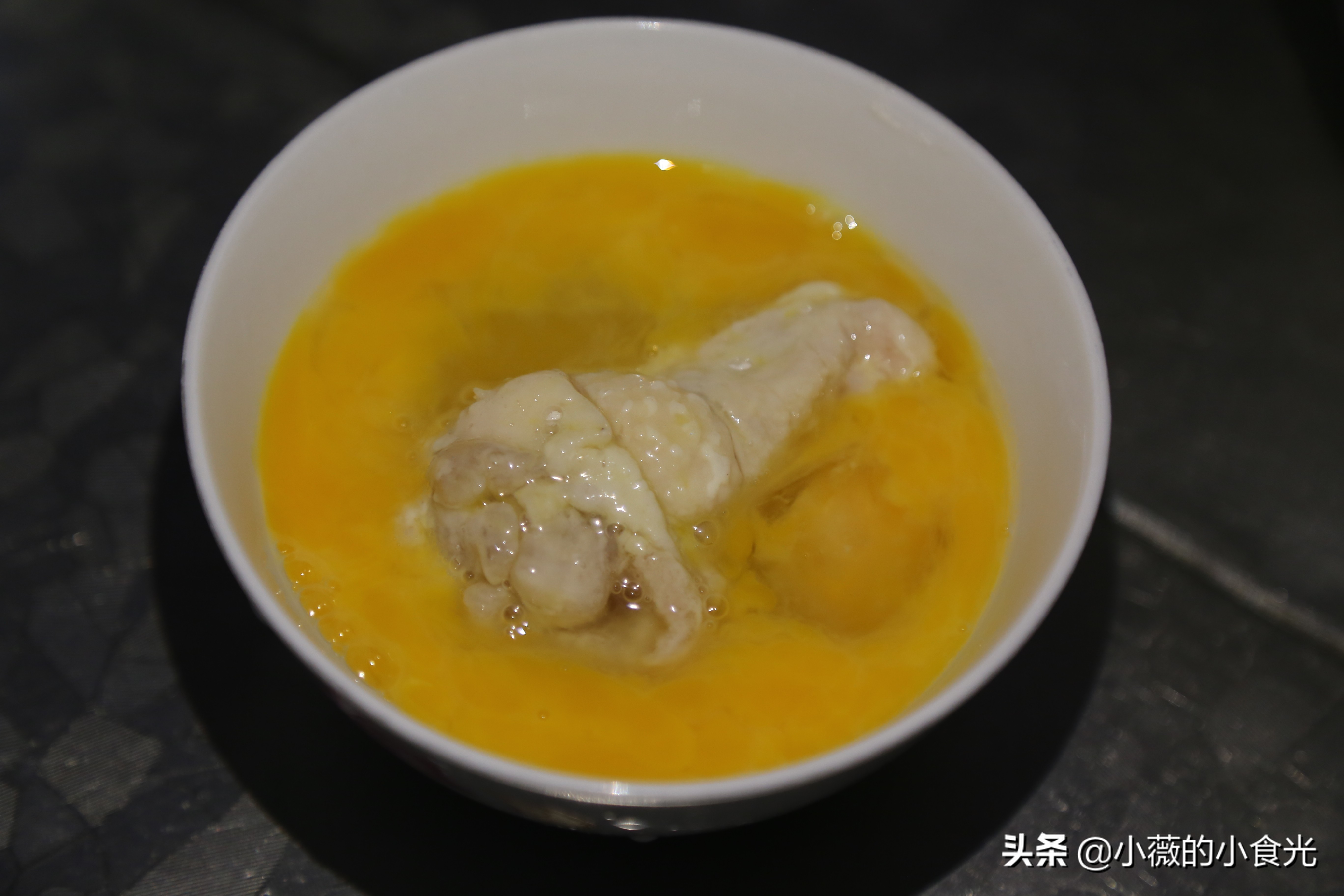 5、 放入鸡蛋液中迅速蘸上蛋液。