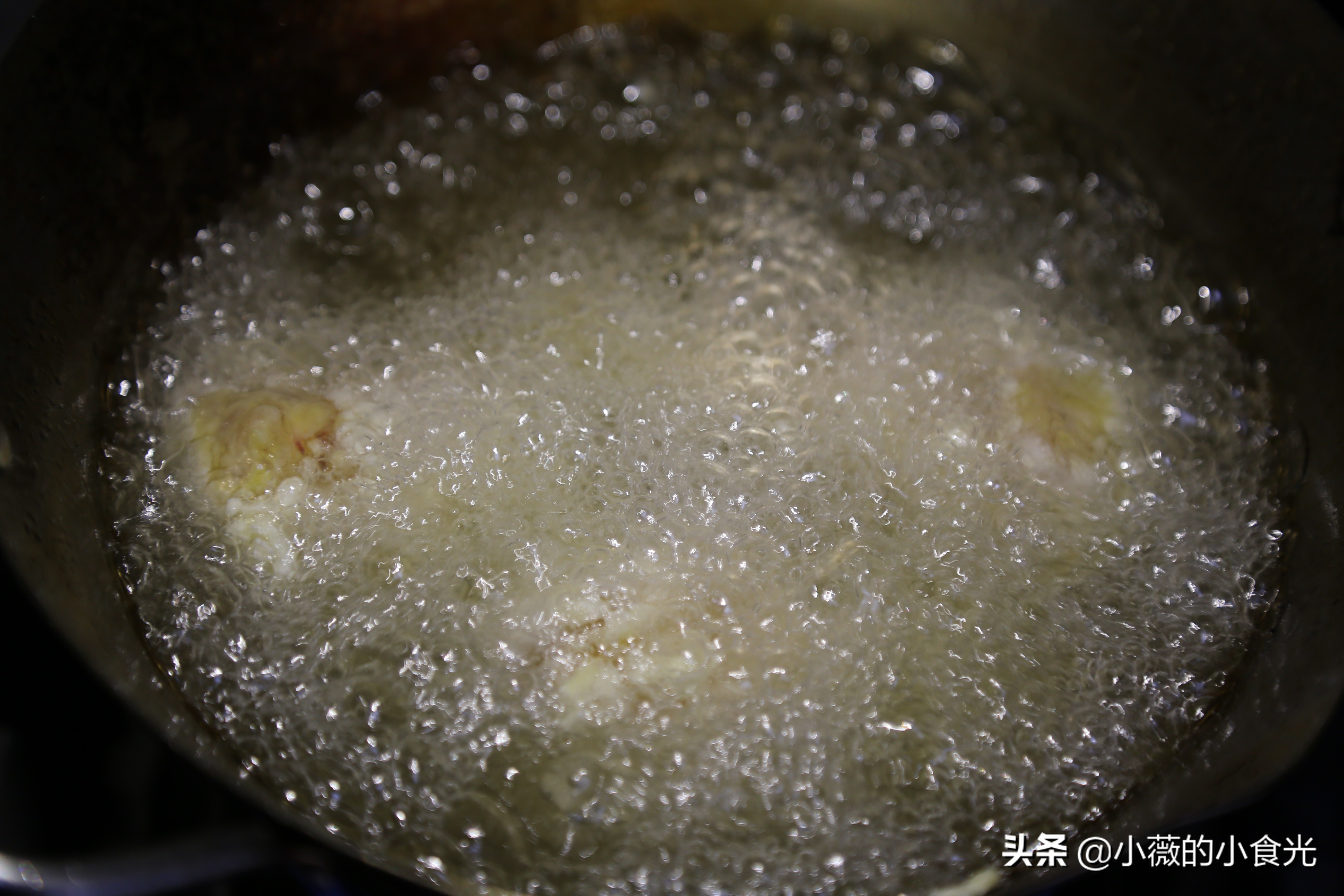 8、 炸鸡翅时全程小火慢炸,大约3-5分钟就已经成熟,表面金黄酥脆,特别诱人。(炸制的时间根据鸡翅的部位和大小有关,翅中时间短些,翅根时间稍微长点),如果想要更酥脆的口感,可以全部炸好后,将油温再烧高些调中大火,放入鸡翅短时间复炸一次即可。