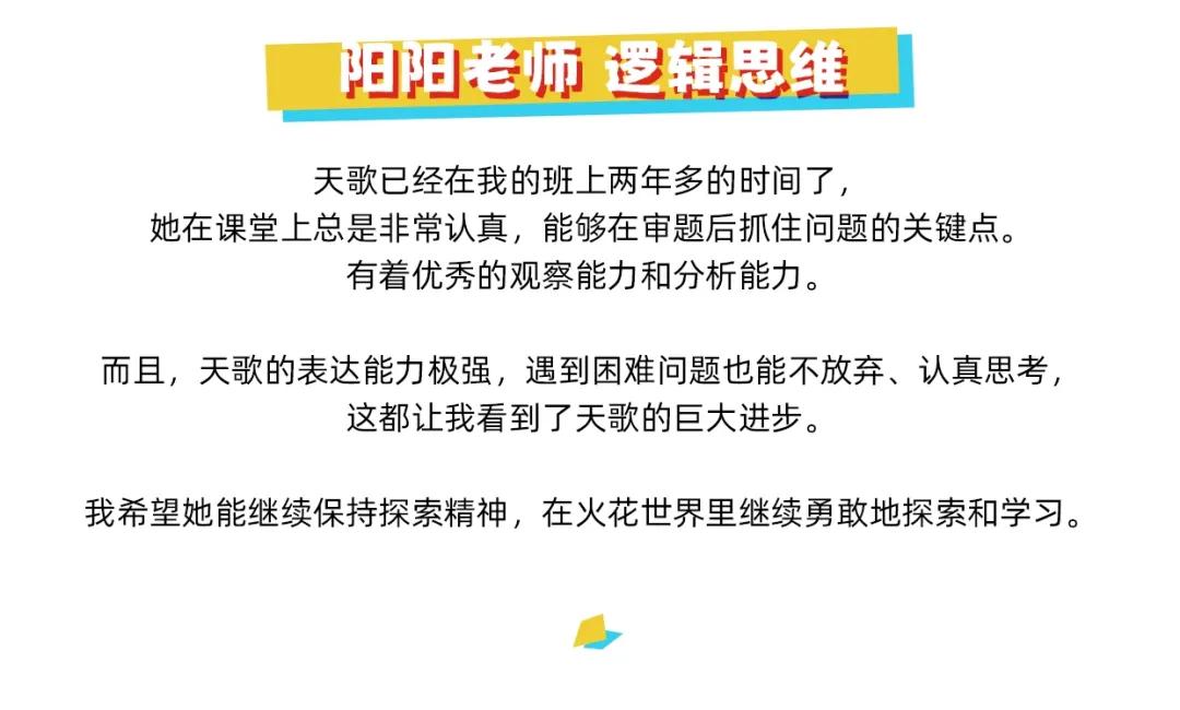 天歌妈妈感慨道:“天歌并不是一开始就能有条理地安排事情的。这都是因为火花思维的课程让她在小时候对学习产生了兴趣,她并不觉得学习是一件枯燥的事情。她愿意把在火花思维课程中学到的逻辑思考方法,运用到生活各个场景中去学习思考,有条理地提出解决方案。这种思维方式不仅让天歌在学业上取得了优异的成绩,也让她在生活中变得更加自信和独立。”