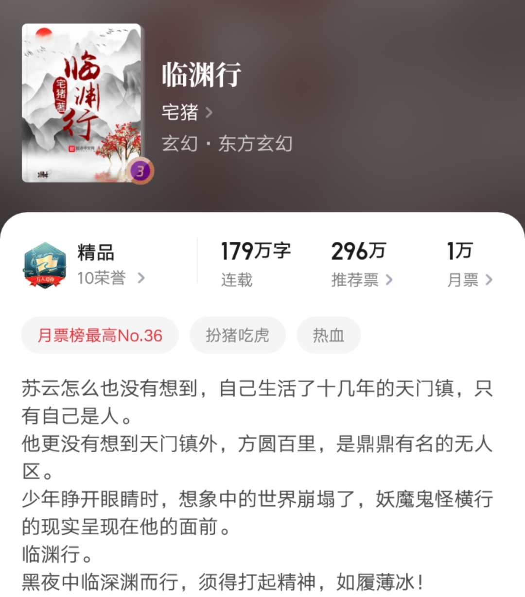 目前宅猪正在连载玄幻小说《临渊行》,这本小说从去年十二月中旬开始连载,到现在还不到九个月的时间。