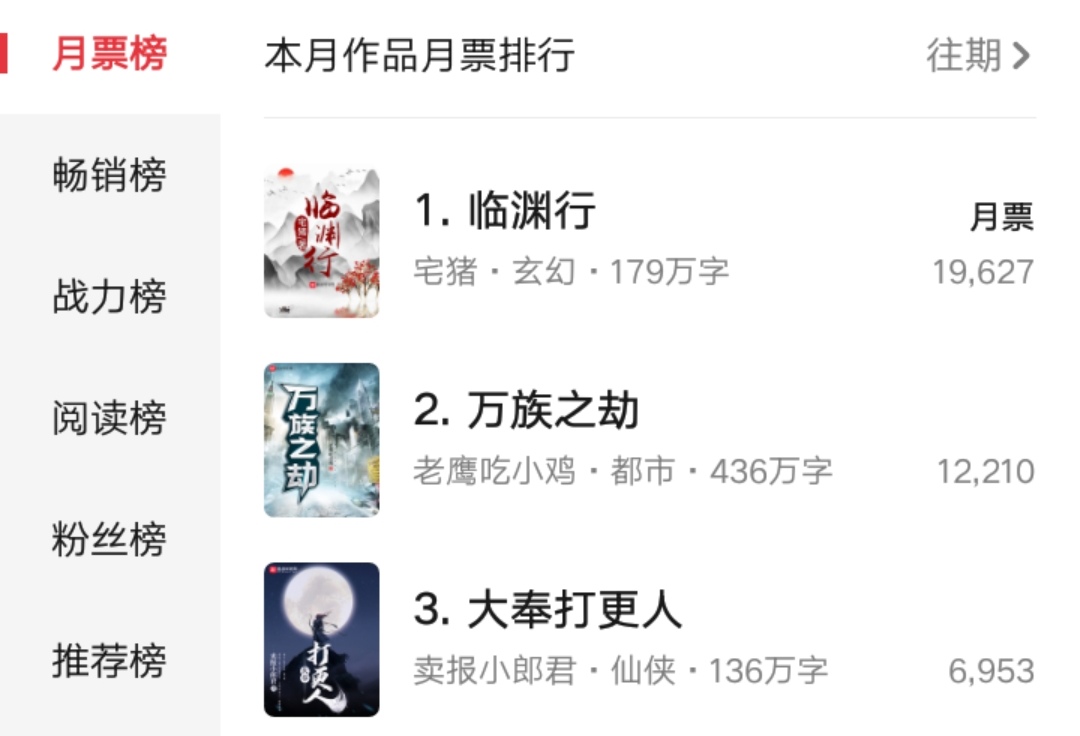 而《临渊行》每月三十几名的成绩,月票就只有一万这样。两者之间存在着十几万的天然差距。