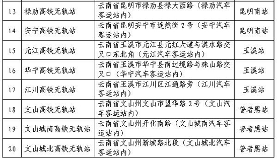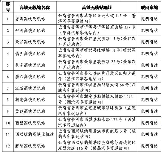 为了让旅客便于乘坐高铁动车,今年8月22日开始,云南省普洱、西双版纳、文山、玉溪、昆明、楚雄6州市的28个县市区交通运输企业,与中国铁路昆明局集团有限公司昆明铁路旅行服务有限公司签订了高铁无轨站合作协议,共设立了28个高铁无轨站。以上无轨站有一半以上集中在民族自治县和民族聚居地,对方便民族群众出行,带动民族地区脱贫具有重要意义。