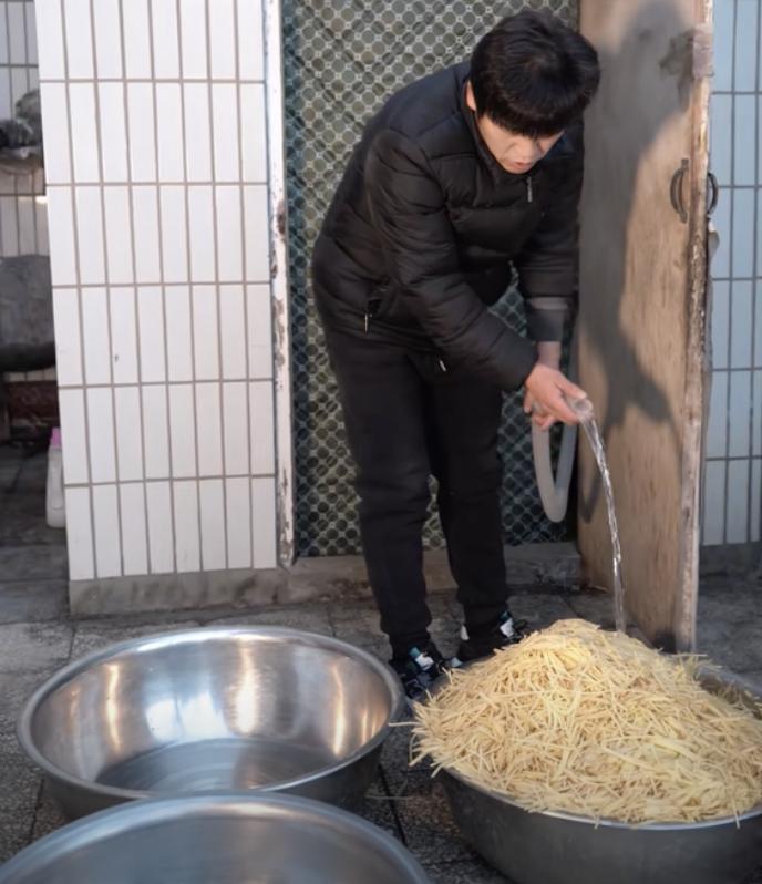 收摊回家后,他还要准备第二天的材料。饼是自己一个个擀出来的,洋葱土豆丝也是自己一遍遍清洗加工的。