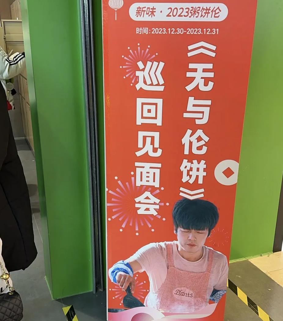 “ 粥饼伦 ” 的名字被贴到了地面的指向标上,有他照片的易拉宝也在活动现场立了起来。