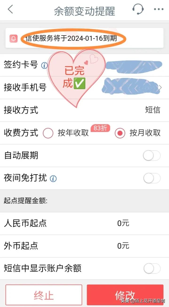第二步:选择你已使用的短信服务银行卡,然后选择终止。终止可以选择立即终止、到期终止。到期终止,是指下一个扣费日前还可以收到短信提醒。