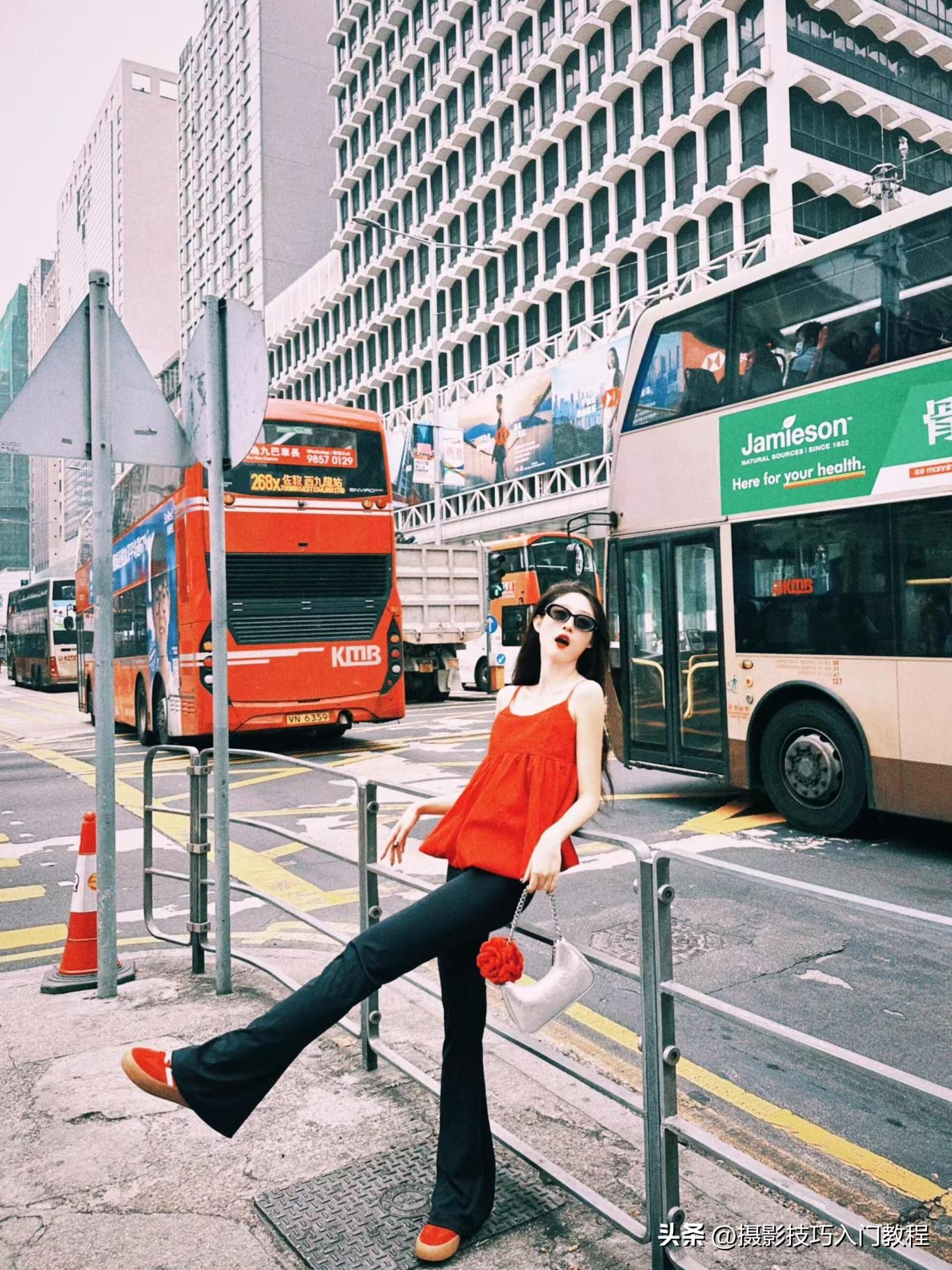 7、走在城市街头肯定少不了来一张city walk照,可以将双手搭在道路的围栏上,背靠着围栏面向镜头,身体向后仰,抬起一条腿,一张美美的city照就有了。